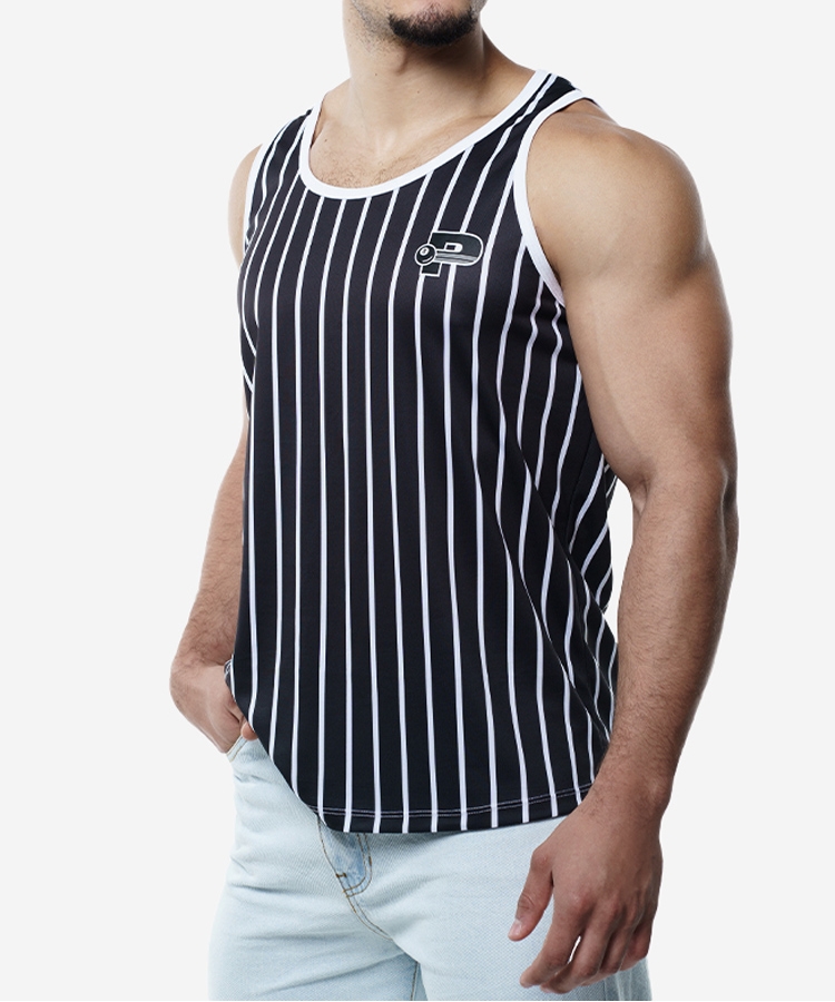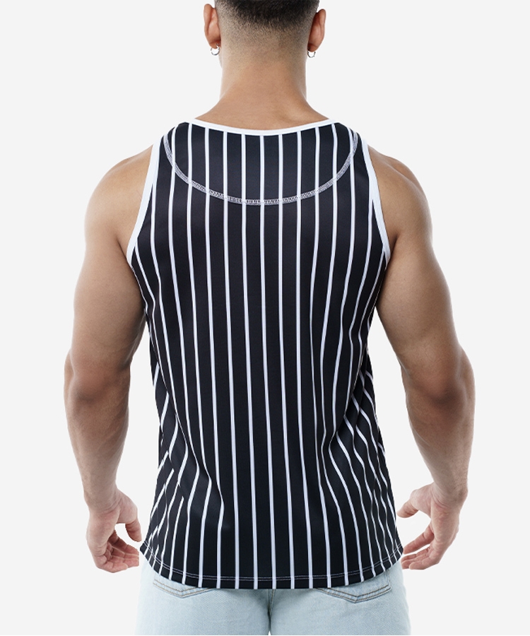 €50,00 Incl. VATElevate your style with a timeless twist. This black and white tank top delivers a sleek, baseball-inspired design with classic stripes, all wrapped in a lightweight fabric made from recycled PET bottles. The quick-drying technology allows you to stay fresh despite constant movement.